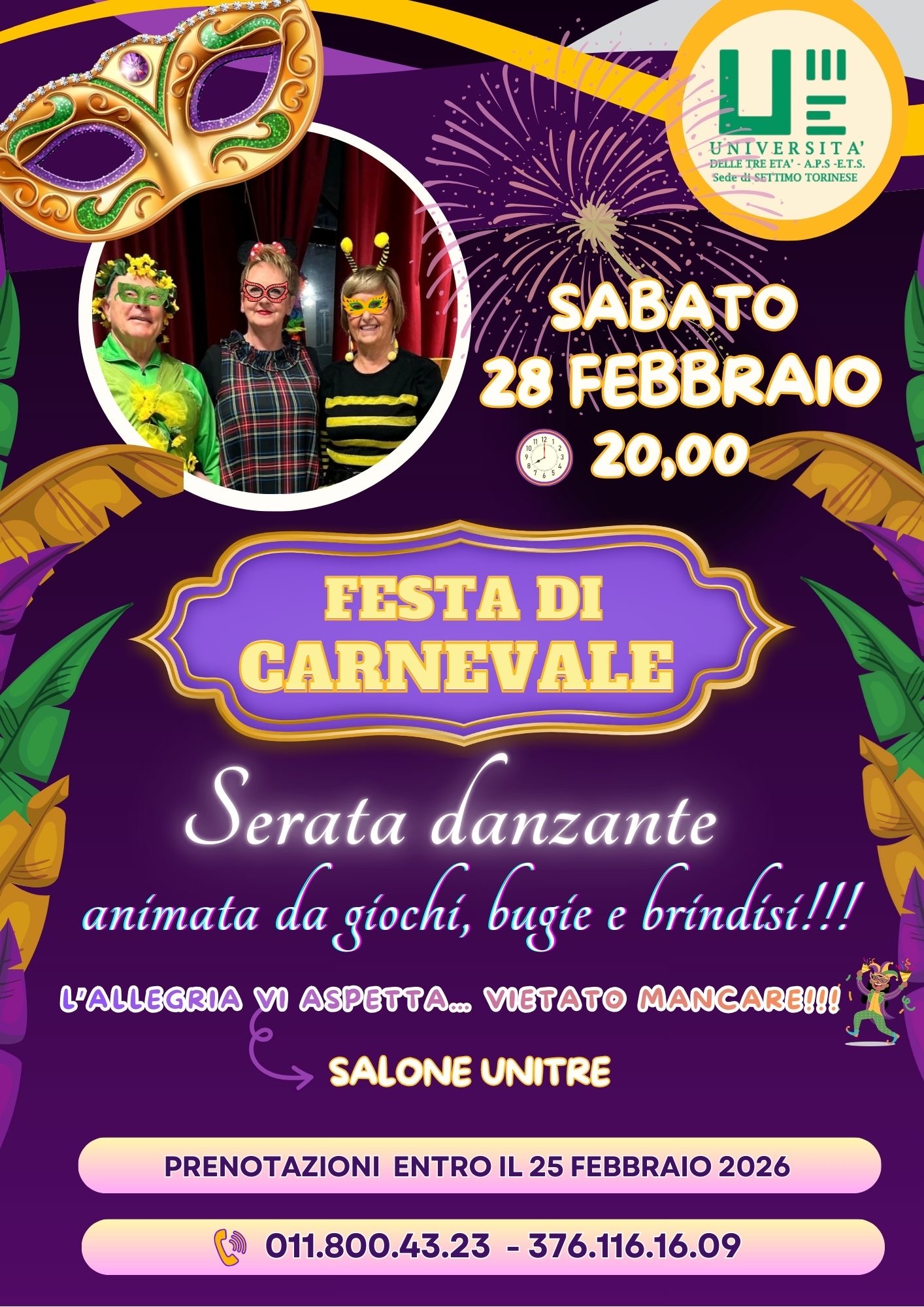 ALLE ORE 20.00 PRESSO IL SALONE UNITRE: SERATA DANZANTE IN MASCHERA FESTEGGIAMO IL CARNEVALE CON GIOCHI, STELLE FILANTI E TANTA TANTA MUSICA