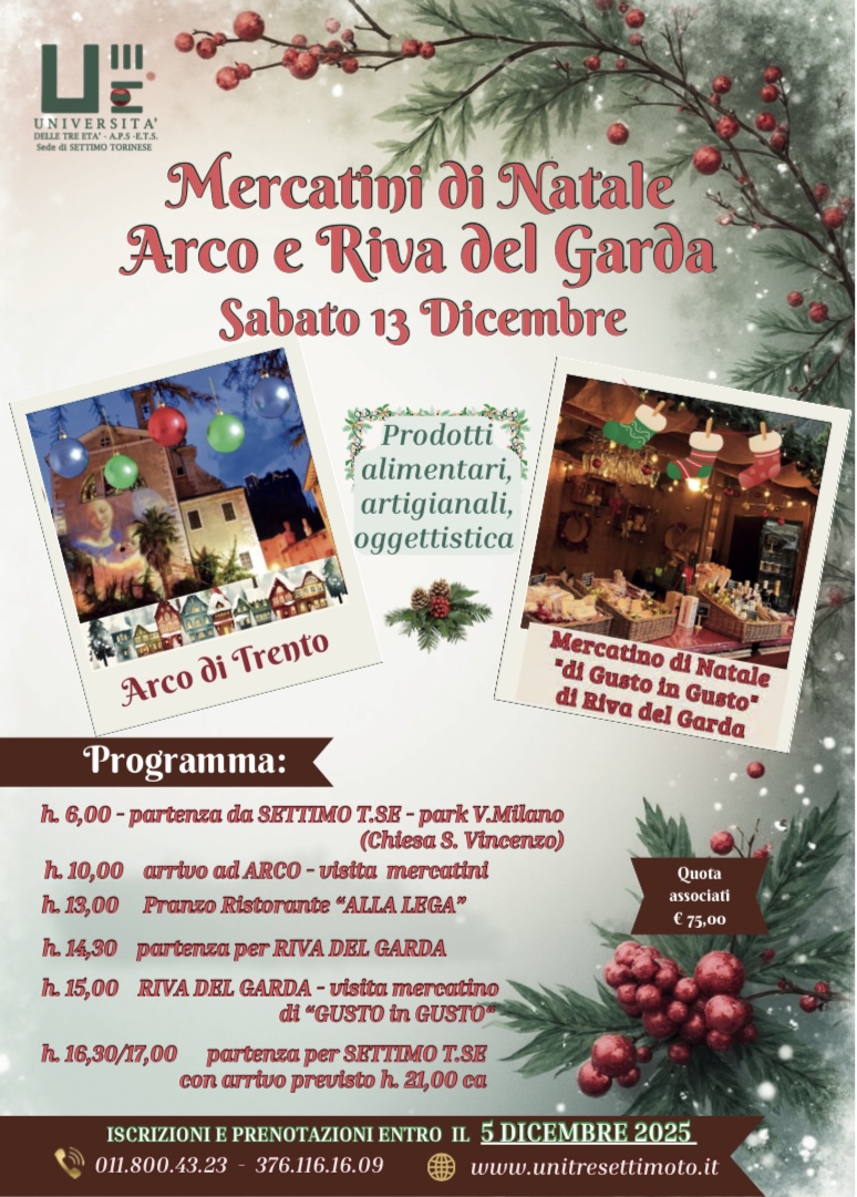 IN ORARIO DA DEFINIRE PARTENZA PER ARCO (TN) ALLA VISITA DEI FAMOSI MERCATINI DI NATALE DOVE SARA' POSSIBILE FARE I PRIMI ACQUISTI NATALIZI. IN PROSSIMITA' DELL'EVENTO VERRANNO INVIATI IL PROGRAMMA DETTAGLIATO E LA RELATIVA QUOTA DI...