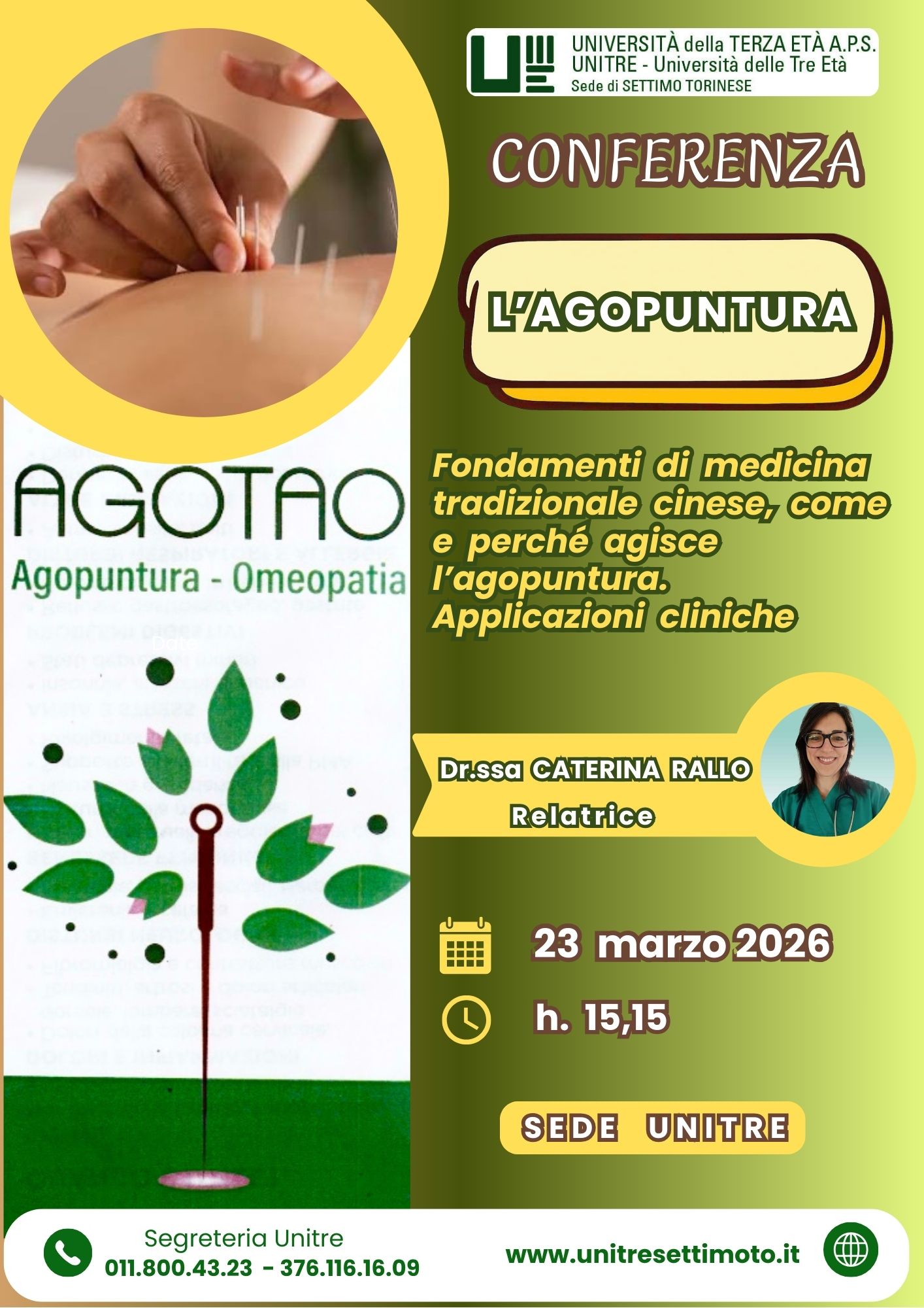 ORE 15,15 - PRESSO SEDE UNITRE DI SETTIMO TOR.SE CONFERENZA DAL TITOLO "L'AGOPUNTURA - Fondamenti di medicina tradizionale cinese, come e perchè agisce l'agopuntura. Applicazioni cliniche"" RELATRICE dott.ssa CATER...