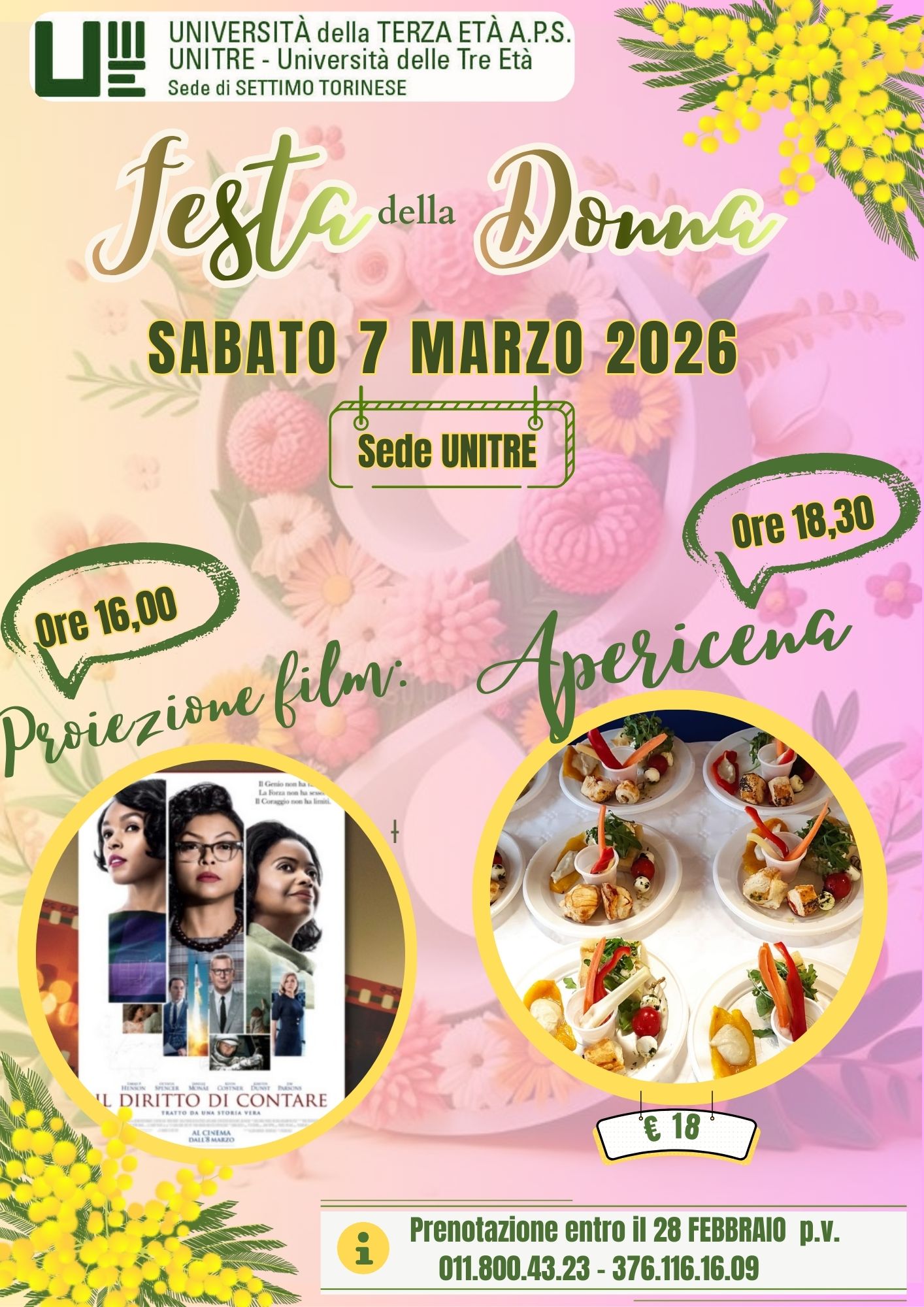 IN OCCASIONE DELLA GIORNATA INTERNAZIONALE DELLE DONNE  PRESSO LA SEDE UNITRE : ALLE ORE 16,00 PROIEZIONE DEL FILM "IL DIRITTO DI CONTARE" ALLE ORE 18,30 APERICENA VI ASPETTIAMO!